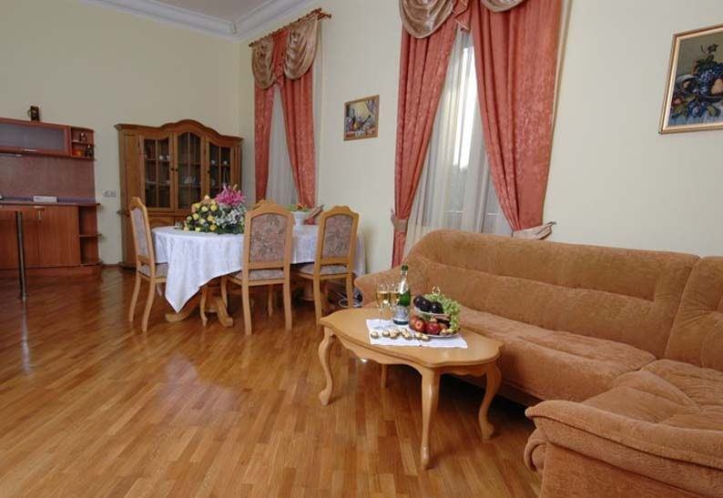 В просторном люксе вы найдете всю необходимую мебель для вашего комфорта. Он имеет площадь 55 кв.м.