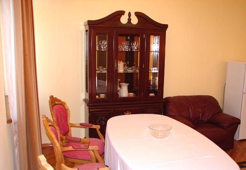 Здесь предусмотрена двуспальная кровать, диван и кресла, обеденный стол и стулья. Также в вашем пользовании будут сервант с посудой, туалетный столик, гардероб и тумбы.