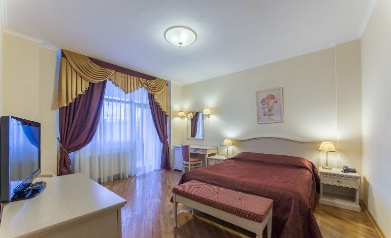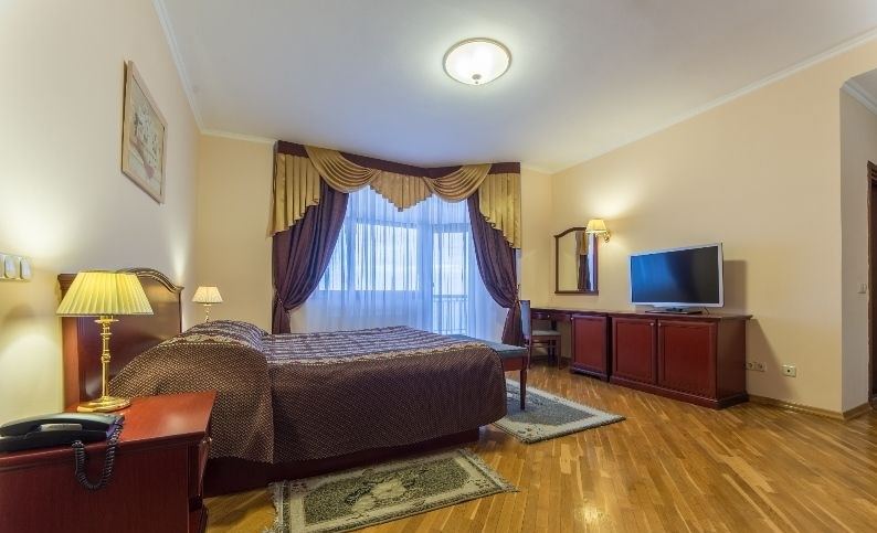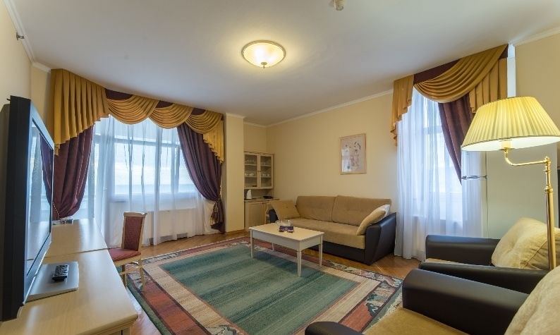 В оснащение входят: телевизор, телефон, диван и кресла, журнальный столик, сервант, косметический столик, шкаф и тумбы.